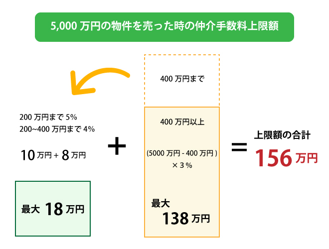5,000万円の物件が売れた時の仲介手数料は、取引額400万円までの部分が18万円、400万円から5,000万円までの部分が138万円なので、合計で156万円が上限額になります。