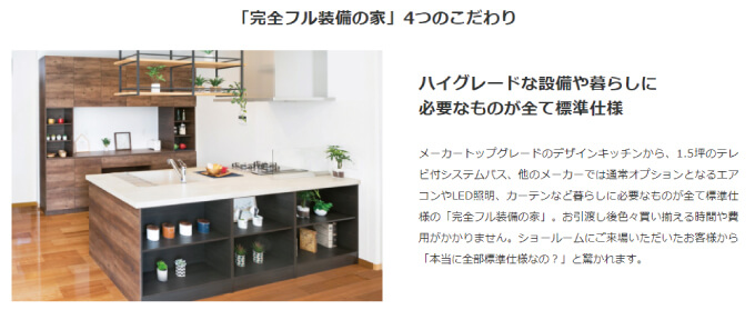 最大の特徴は、「完全フル装備の家」を打ち出して、標準仕様の設備をハイグレードタイプにしている点。 高価な設備を一括で仕入れることで「完全フル装備の家」を実現しています。