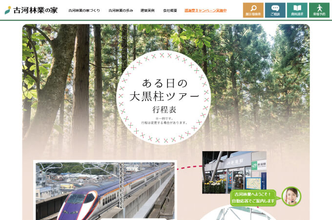 さらには、契約者を対象に「大黒柱ツアー」を行っているのもユニークな点です。 お客様自身が古河林業の保有林に足を運び、プロのサポートを受けながら大黒柱とする木を選ぶことができます。 大黒柱は家のシンボルとなる建材なので、思い入れが一層深まることでしょう。