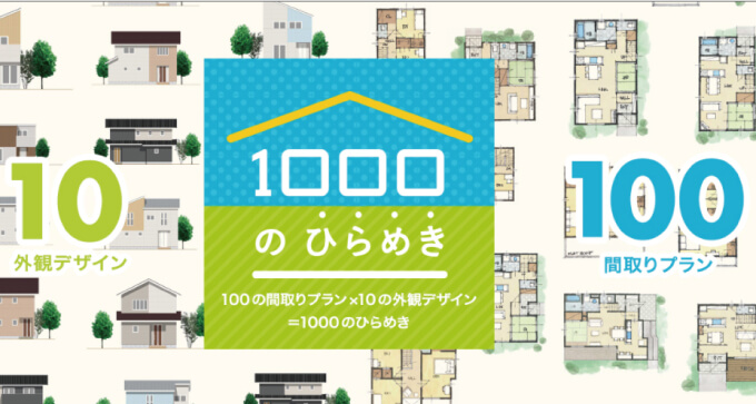 また、「1000のひらめき」と名付けられたプランでは、10種類の外観、100種類の間取りからユーザーが選べるようになっています。このプランは、36,000棟を超える実例を参考にして一級建築士が考案しました。
