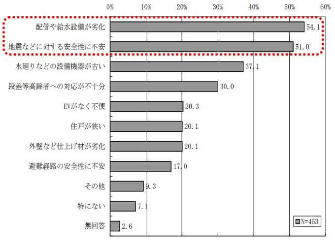 「現在のマンションの問題点」を題名にアンケート調査したところ、安全性(耐久性)よりも「配管や給水設備が劣化」の方が問題としては多いと判明しました。