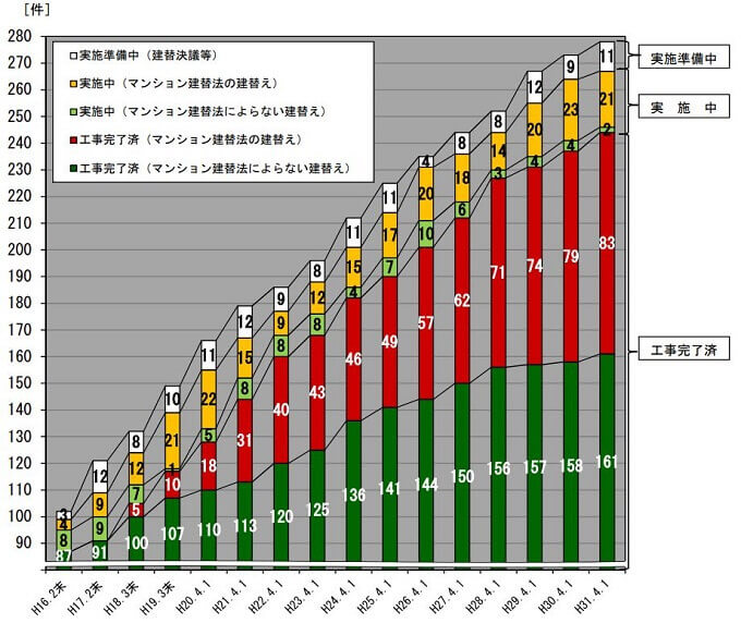 上のグラフは、平成16~31年度において建て替えたマンションの数を表しています。