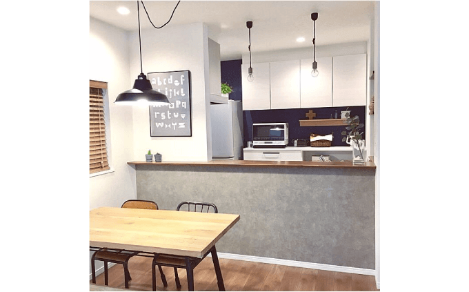 リビングの壁は白でも、キッチンの壁にアクセントを入れるとインパクトがあります。また、以下のようにキッチンカウンターにアクセントを入れても、シックな雰囲気が出ますね。