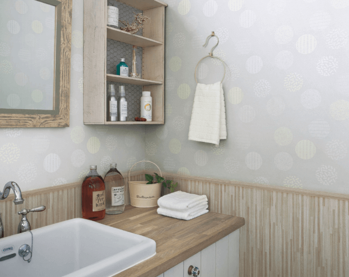 洗面所は、写真のようなさり気ない水玉模様や、タイル調のクロスを使ってもいいですね。意外にもぴったりくるクロスが多いため、水まわりのクロスをどれにしようか悩んでしまう方が多いようです。