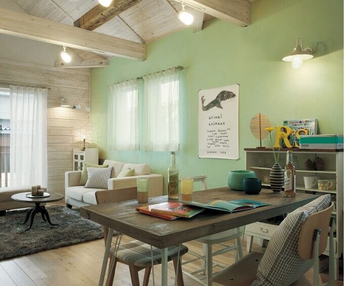 天井や梁、他の壁が白を貴重としたナチュラルな木目なので、壁一面がグリーンでもどぎつさを感じません。まるでカフェのような雰囲気のあるお部屋ですね。