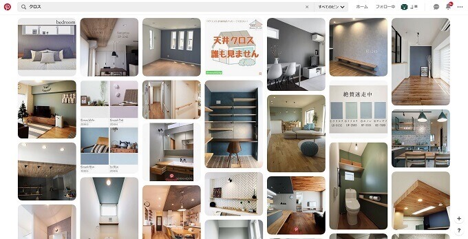 インスタグラムよりも大量に効率よく写真を見ることができ、日本のサイトだけでなく、海外のサイトがピンされている場合もあるため、海外のオシャレなお部屋写真もチェックできます。試しに「クロス」で検索してみた結果が以下です。