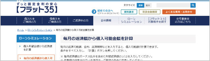 画像引用元:フラット35「ローンシミュレーション」|毎月の返済額から借入可能金額を計算