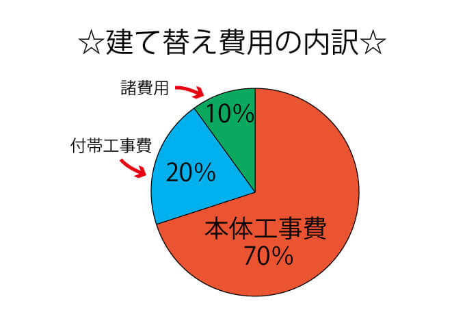 なぜなら、建て替え費用は建築費用と直接関係のない費用も含んでいるからです。それぞれの費用項目が全体に占める割合は以下の通りです。