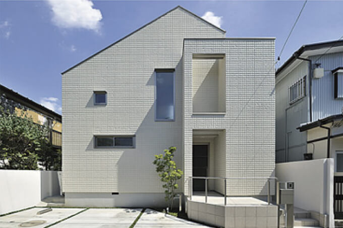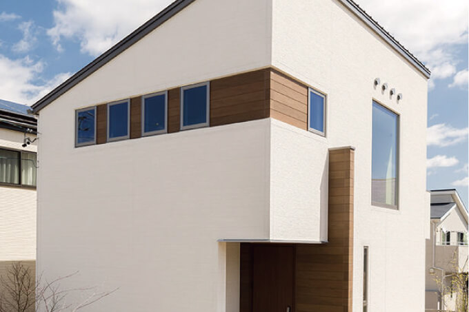 清涼感のある白の外壁に、横一列に並ぶ窓がアクセントとなっているお家です。